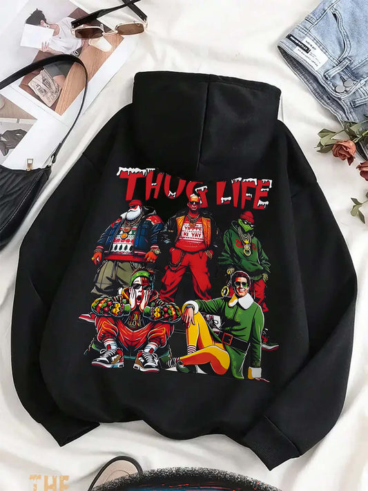 Men'S Casual Hooded Sweatshirt with Thug Life Graphic Print, Polyester Knit Fabric, Regular Fit, with Drawstring Hood, Slight Stretch, Alphabet Pattern for Fall/Winter